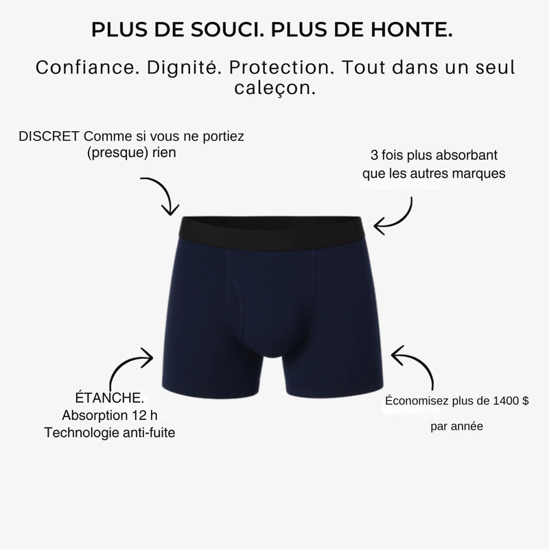 Marre de l'anxiété? Reprenez le contrôle de votre vie! Nos boxers ultra-absorbants sont si discrets et confortables que vous oublierez les accidents. Sentez-vous libre, confiant, et vivez pleinement, sans limites.